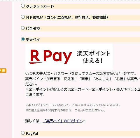 カート画面のお支払い方法の指定箇所に、楽天Payも含まれました。